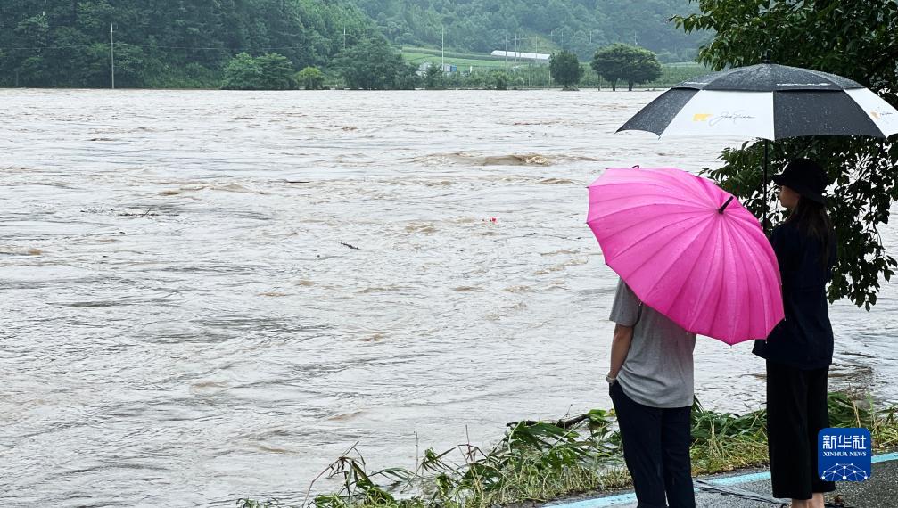 7月15日,在韓國忠清北道槐山郡,市民望著(zhù)洪水。