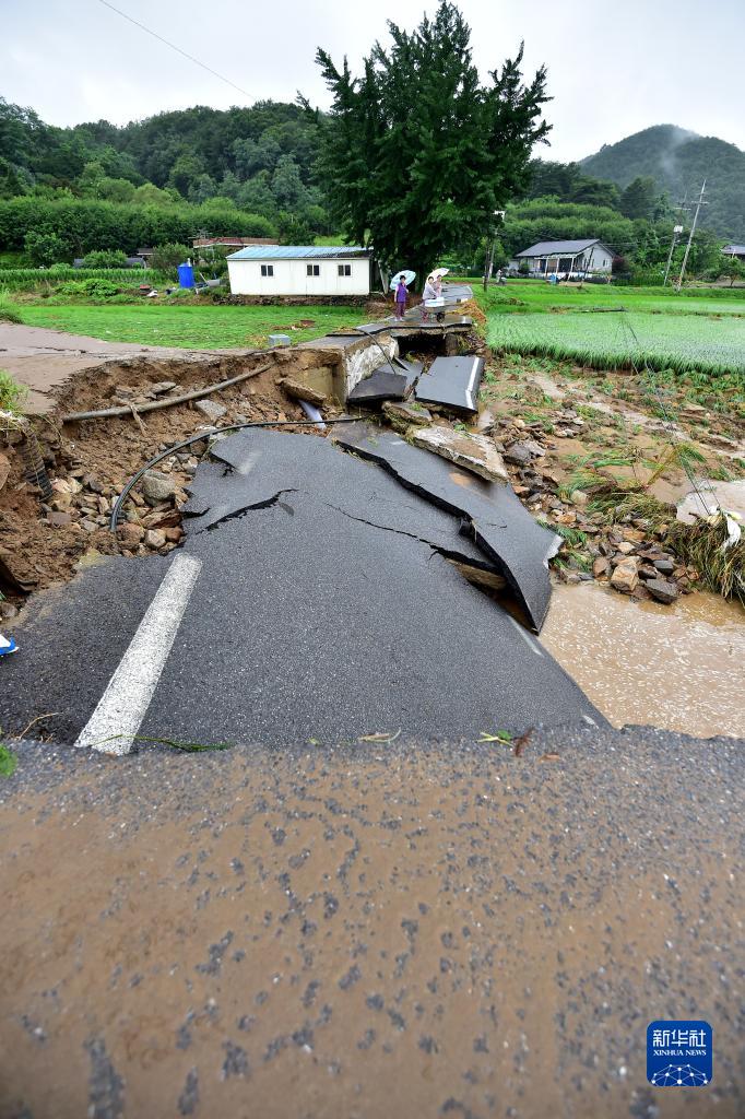 這是7月15日在韓國慶尚北道醴泉郡拍攝的在暴雨中坍塌的道路。