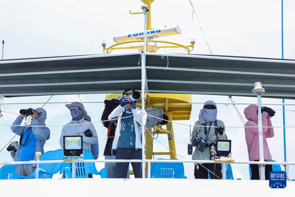 6月29日,第六次南海深潛及遠海鯨類(lèi)科考航次的科研人員在南海某海域進(jìn)行目視觀(guān)測。