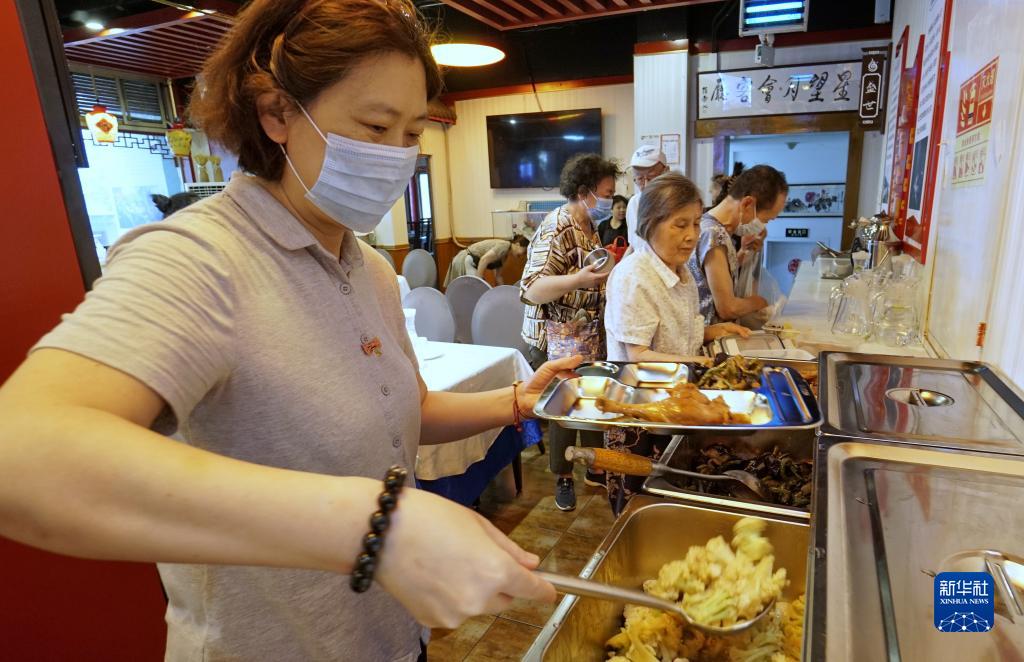 7月14日,在東城區東華門(mén)街道,一家“爸媽食堂”的員工為老人盛飯。