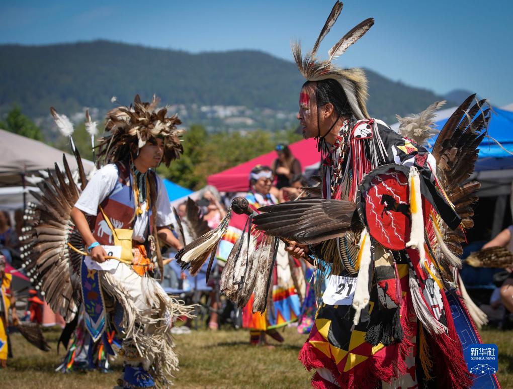 7月15日,在加拿大溫哥華,穿著(zhù)傳統盛裝的印第安原住民參加“帕瓦”活動(dòng)。
