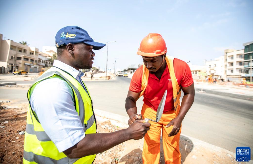 5月13日,蘇信(左)在塞內加爾達喀爾快速公交項目建設工地與同事交流。新華社記者 李亞輝 攝
