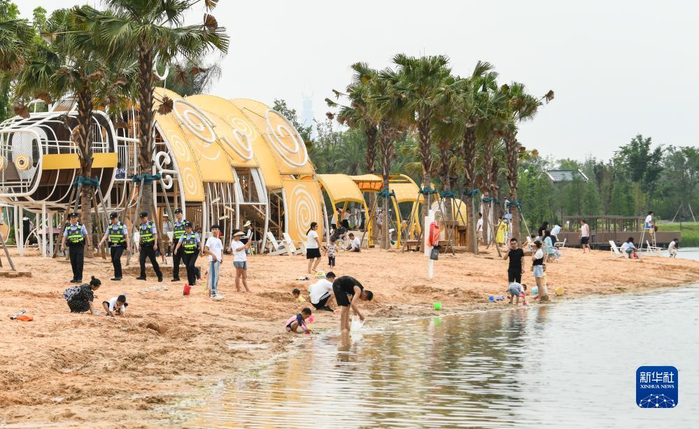 在成都市龍泉驛區東安湖體育公園銀沙灘,杜以萍(左五)帶領(lǐng)民警在沙灘上巡查(7月12日攝)。