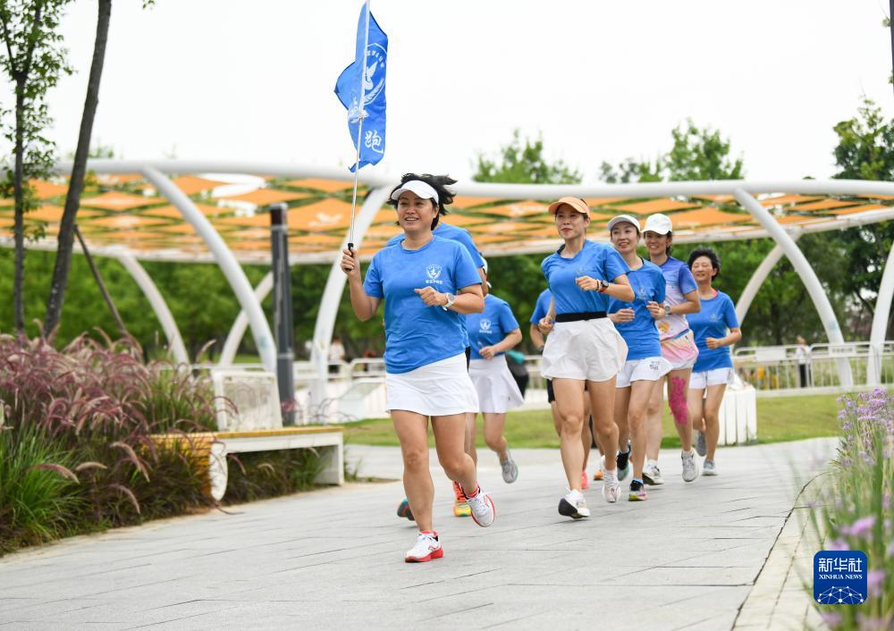 在成都市龍泉驛區東安湖體育公園,杜以萍(前)帶領(lǐng)跑團成員跑步(7月12日攝)。