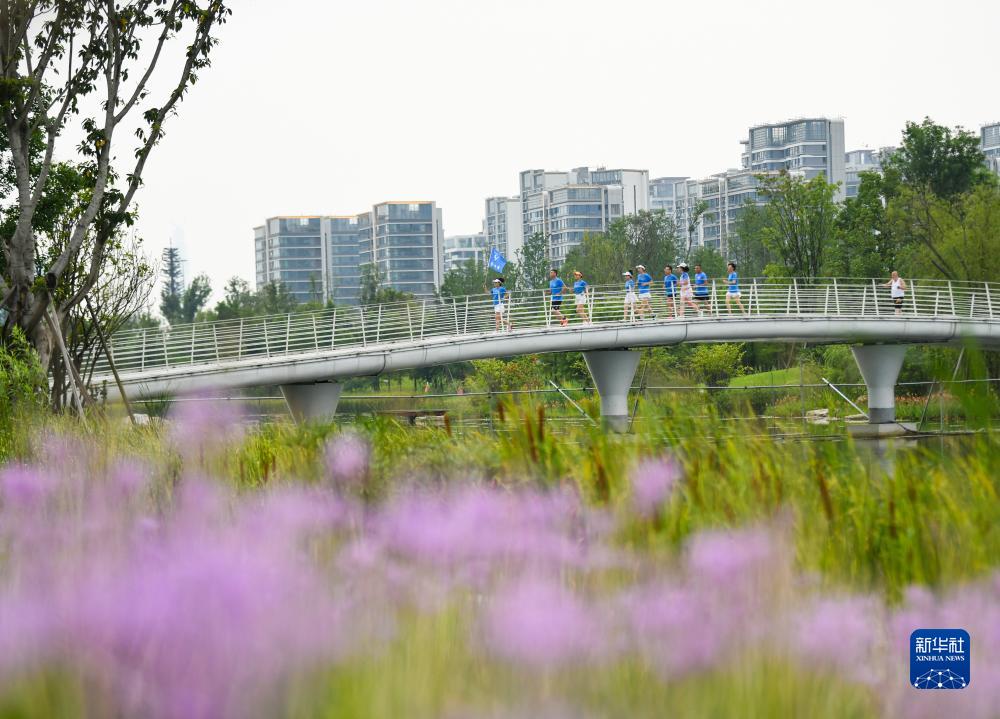 在成都市龍泉驛區東安湖體育公園,杜以萍(左一)帶領(lǐng)跑團成員跑步(7月12日攝)。
