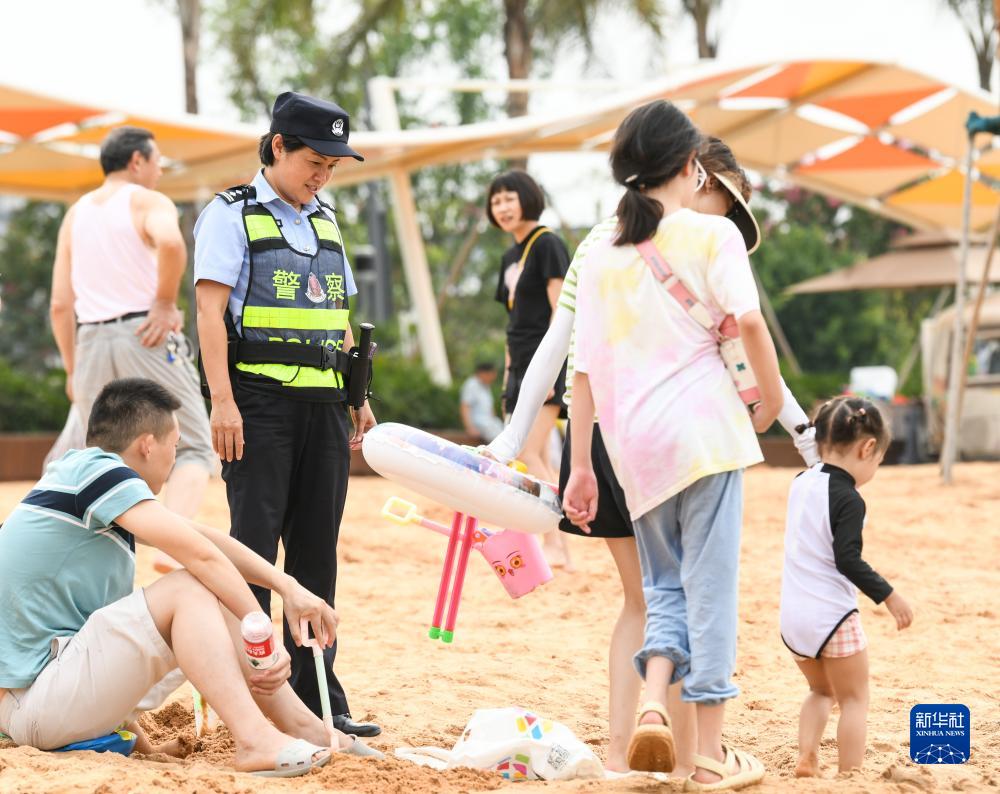 在成都市龍泉驛區東安湖體育公園銀沙灘,杜以萍(左二)提醒帶著(zhù)孩子游玩的家長(cháng)注意安全(7月12日攝)。