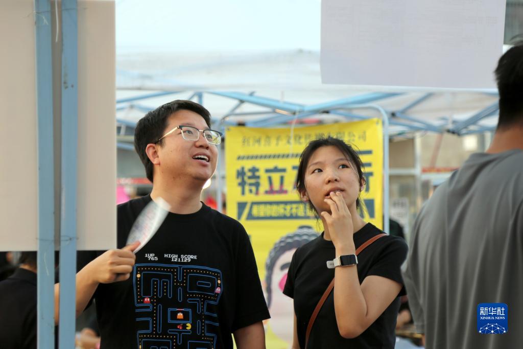7月15日晚,求職者在云南省紅河哈尼族彝族自治州蒙自市大樹(shù)寨的“青年人才夜市”招聘會(huì )現場(chǎng)查看崗位信息。