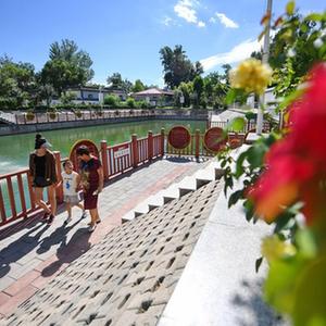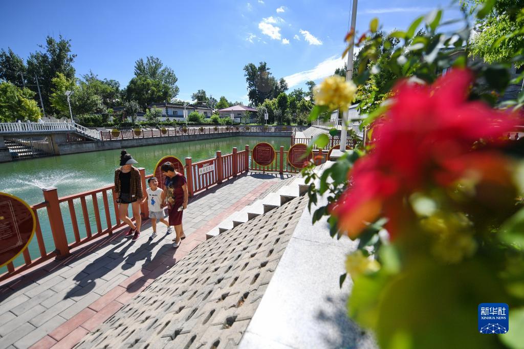 7月16日,村民在河北省涿州市東仙坡鎮西仙坡村由垃圾坑塘經(jīng)過(guò)治理建成的游園內行走。