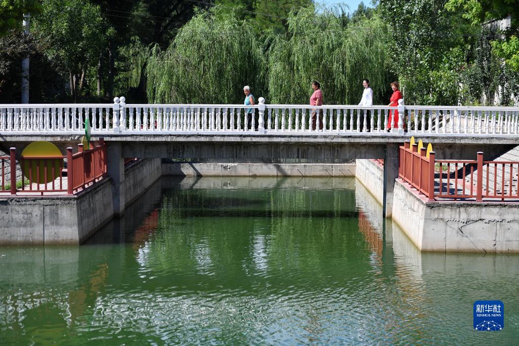7月16日,村民在河北省涿州市東仙坡鎮西仙坡村由垃圾坑塘經(jīng)過(guò)治理建成的游園內行走。
