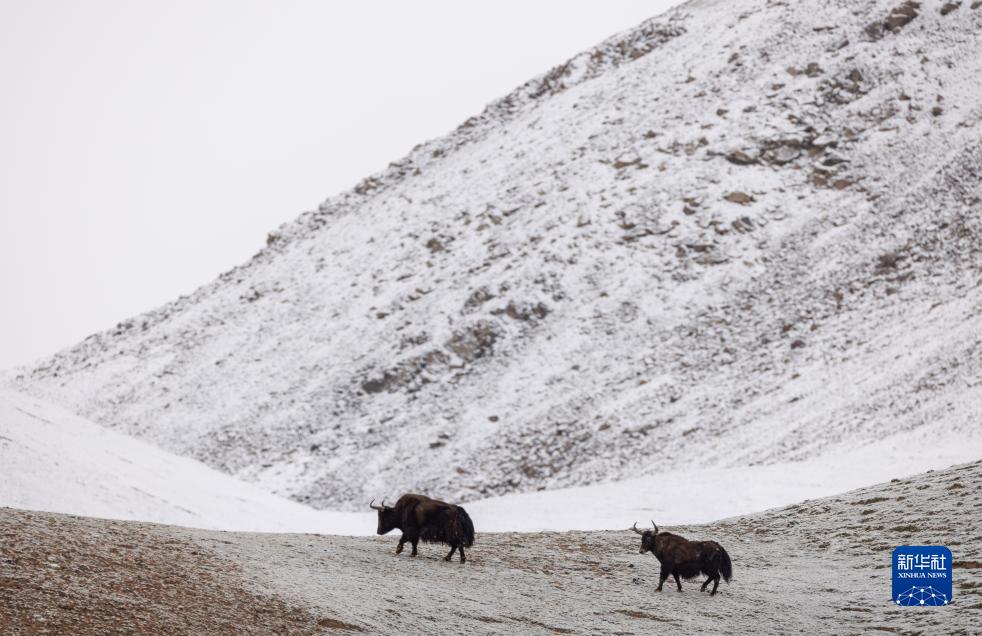 7月2日,在新疆阿爾金山國家級自然保護區,兩只野牦牛爬上積雪的山脊。