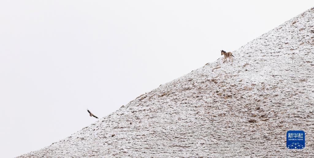 7月2日,在新疆阿爾金山國家級自然保護區,一只藏野驢與一只高山兀鷲在山脊上“對峙”。