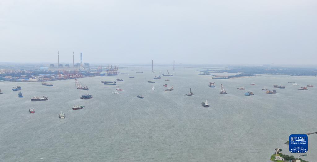 這是7月17日拍攝的在廣東湛江龍王灣水域錨泊防臺的船只(無(wú)人機照片)。