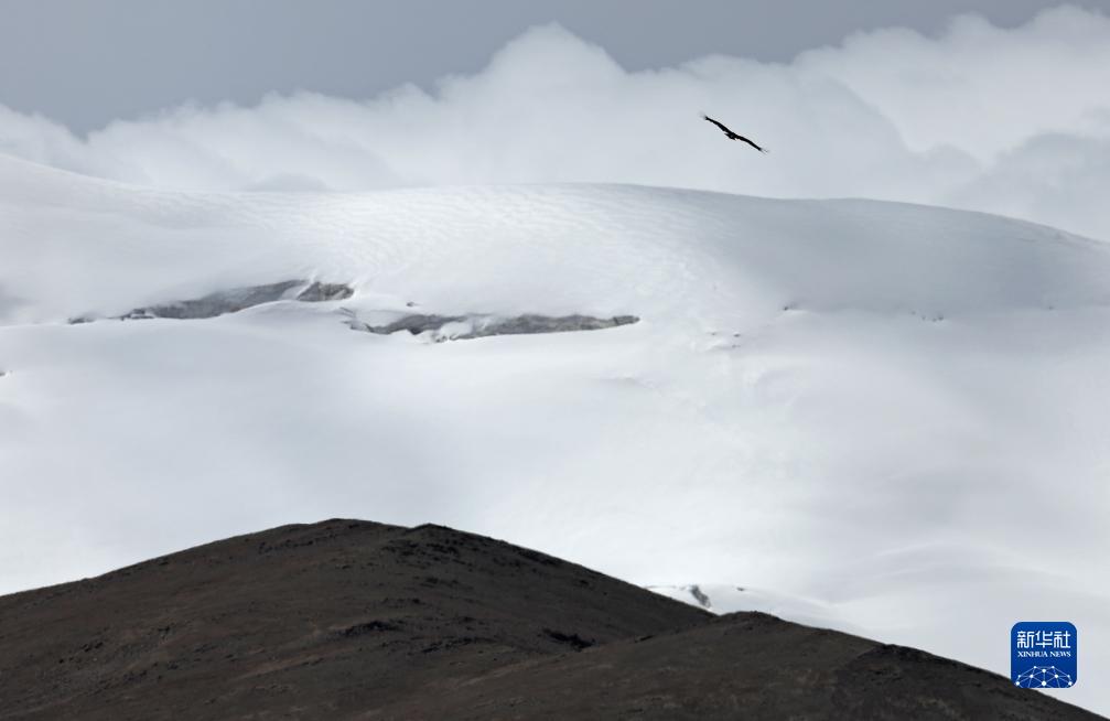 7月8日在新疆阿爾金山國家級自然保護區,一只禿鷲翱翔在木孜塔格峰上空。