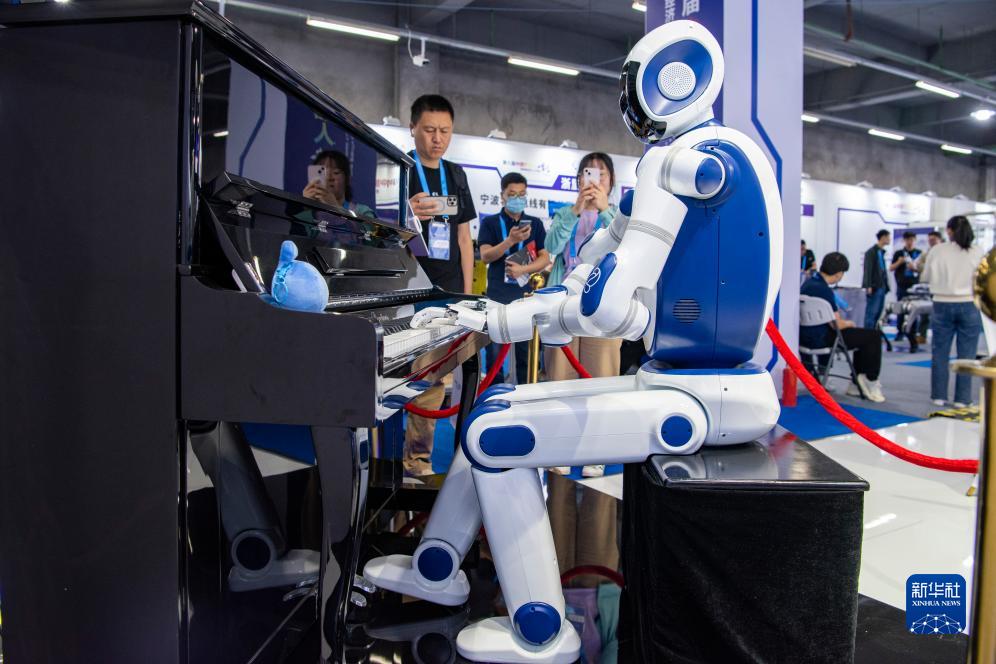 客商在浙江省余姚市舉辦的第八屆中國機器人峰會(huì )上欣賞機器人彈鋼琴(5月24日攝)。