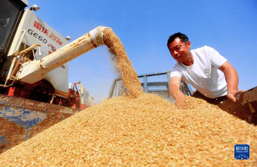 山東省臨沂市平邑縣地方鎮農民將收獲的小麥裝車(chē)(6月13日攝)。