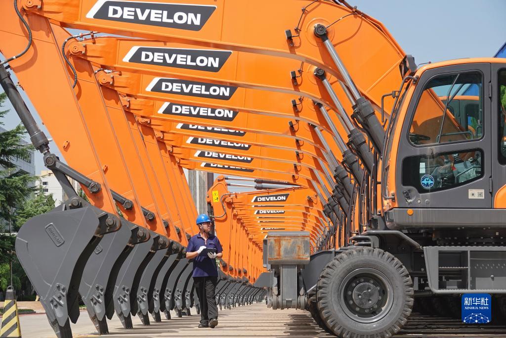 7月17日,在位于山東煙臺的一家工程機械公司,工作人員在檢查出廠(chǎng)的挖掘機。