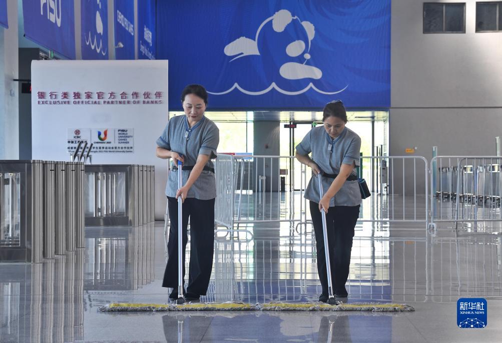7月16日,華潤置地物業(yè)保潔人員在游泳跳水館打掃地面衛生。