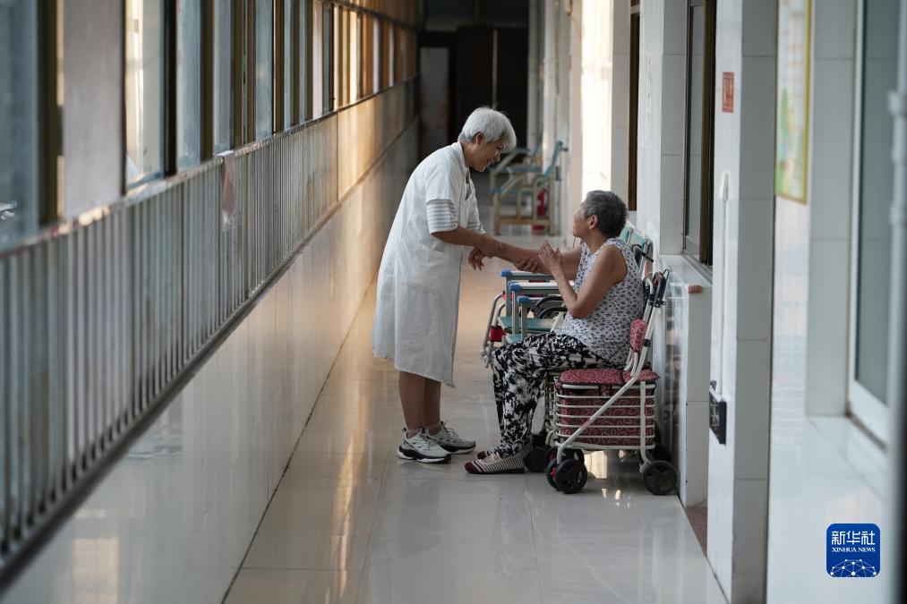 7月17日,在正定縣塔元莊村勁松老年公寓,工作人員在走廊與老人聊天。