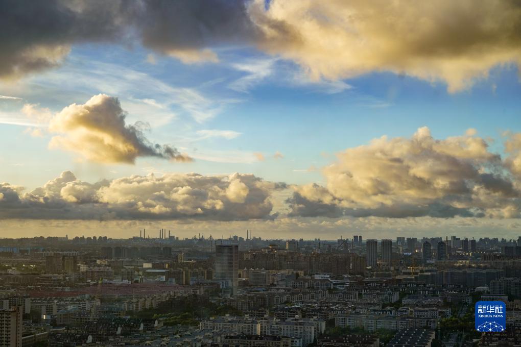 黃昏時(shí)分,上海天空中的云朵被夕陽(yáng)染成金黃色,蔚為壯觀(guān)。