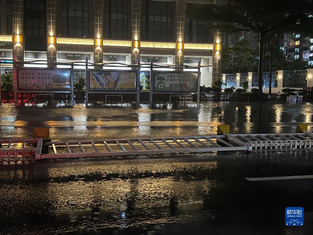 7月17日晚,在廣東湛江海濱大道北,馬路中間的鐵柵欄被風(fēng)吹倒在地(手機照片)。