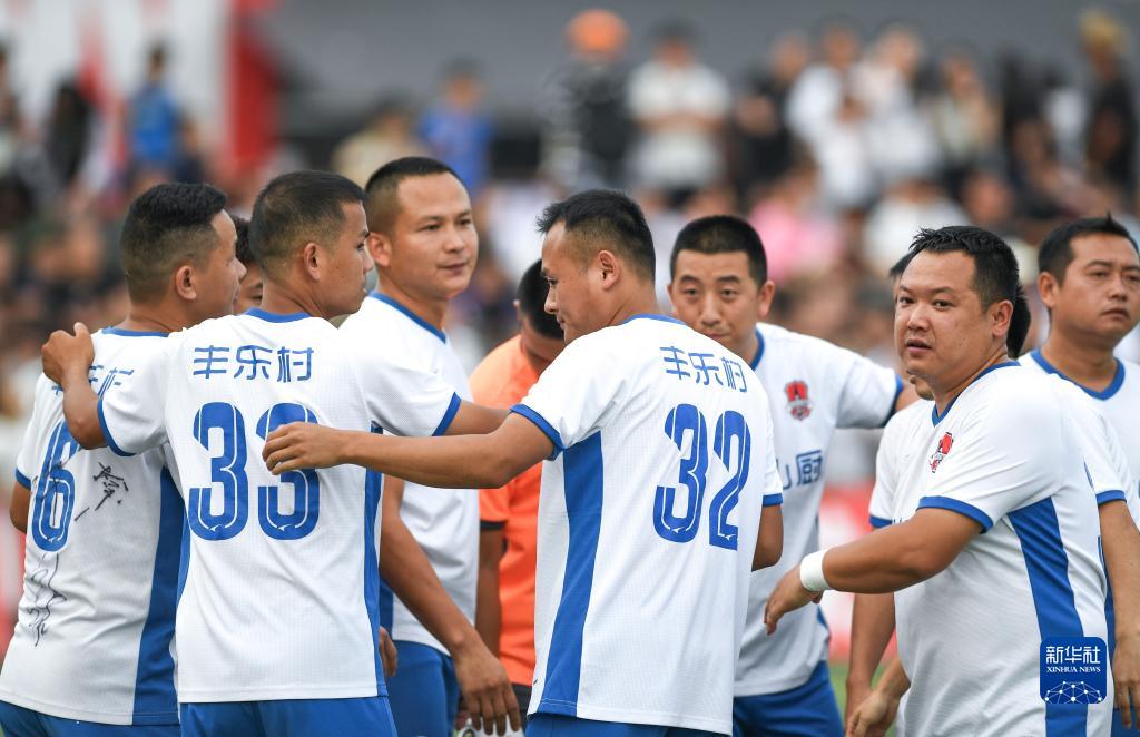7月15日,豐樂(lè )村一隊球員賈勇輝(左一)與隊友們在賽場(chǎng)上相互加油鼓勁。