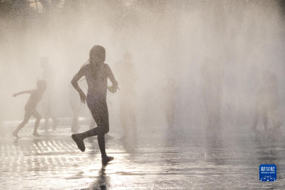 7月17日,一名女子跑入西班牙馬德里的噴泉解暑。