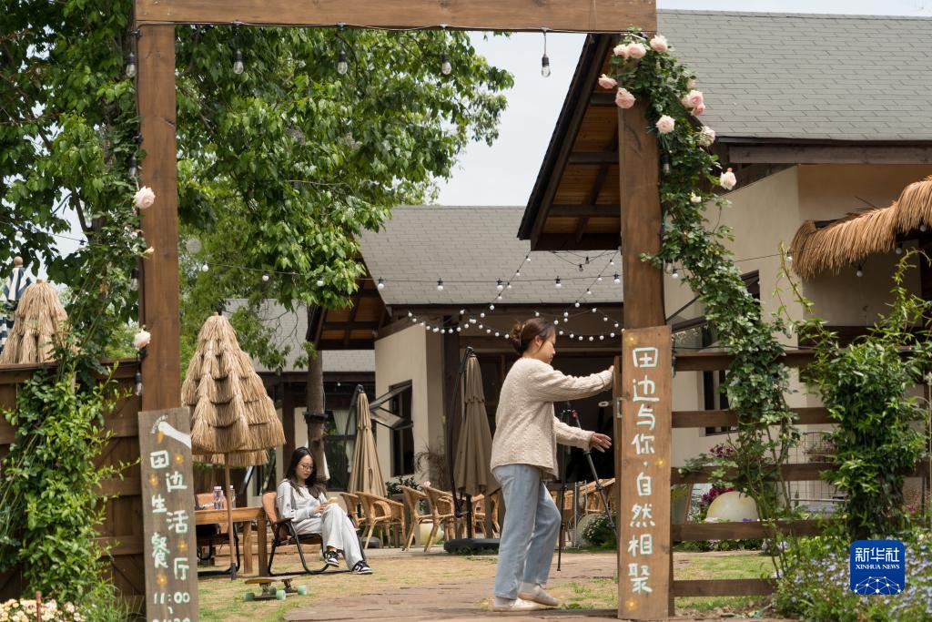 成都市天府新區官塘村一家田園餐廳的店主(右)打開(kāi)店門(mén)(4月25日攝)。