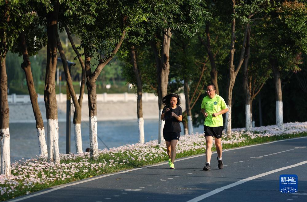 兩位成都市民在錦江綠道上跑步(7月18日攝)。