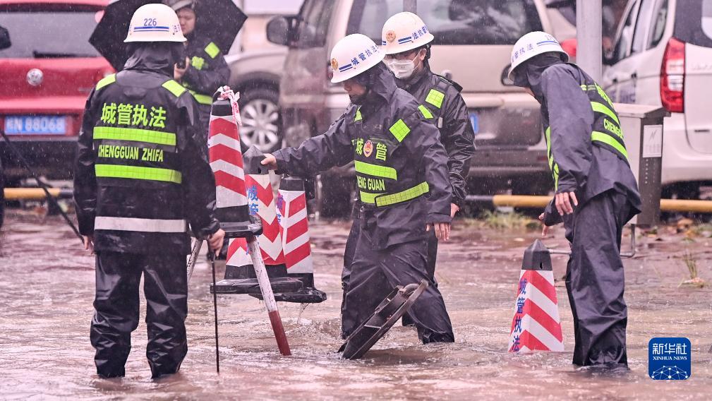 7月18日,廣西欽州市城管工作人員在文峰路排澇。