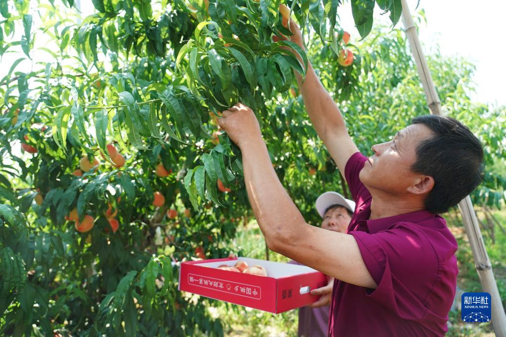 7月18日,桃農在北京市平谷區大華山鎮的一處桃園采摘桃子。