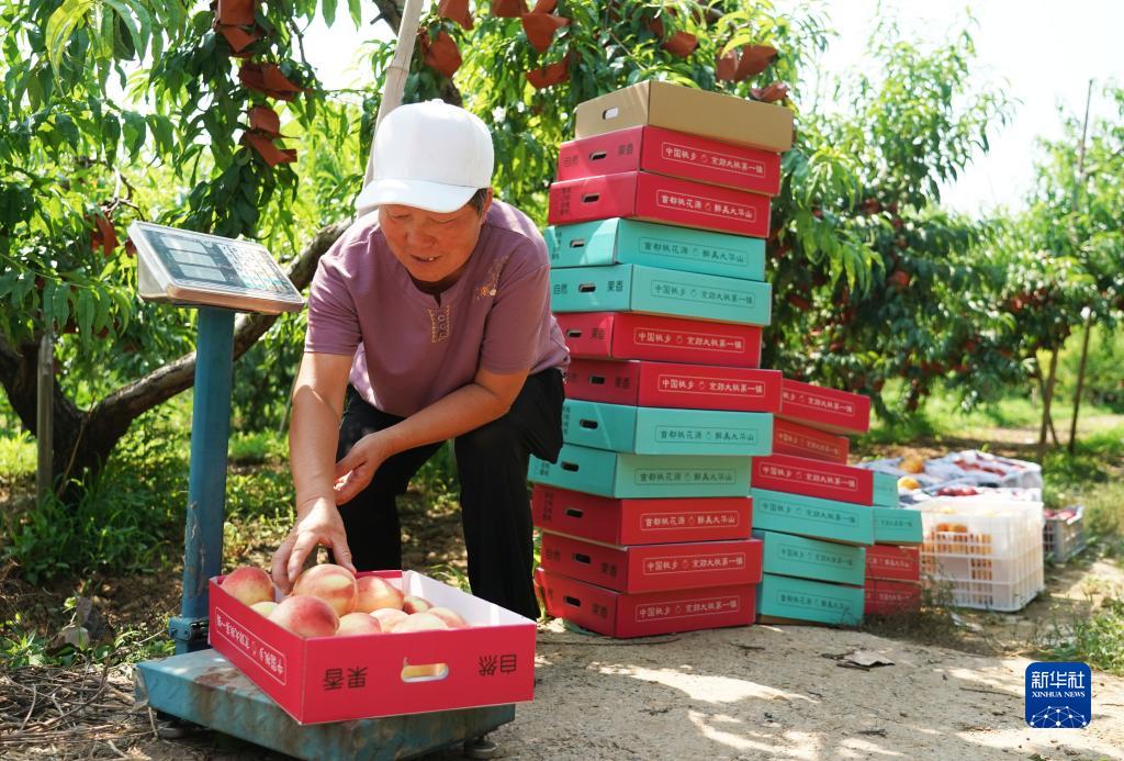 7月18日,在北京市平谷區大華山鎮的一處桃園,桃農將采摘好的桃子稱(chēng)重。