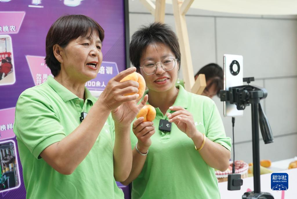 7月18日,在2023北京·平谷鮮桃季“土特產(chǎn)”市集現場(chǎng),工作人員通過(guò)直播的方式進(jìn)行桃子銷(xiāo)售。