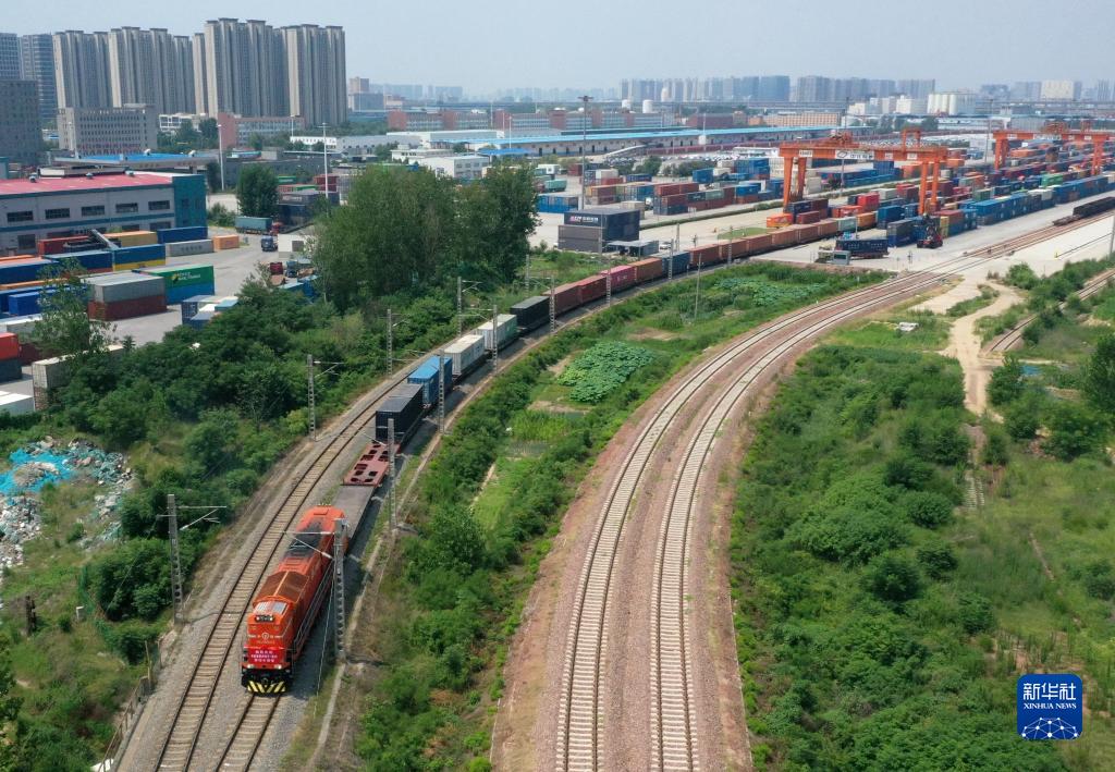 7月18日,X8003次中歐班列(中豫號)駛出國鐵集團鄭州局圃田車(chē)站(無(wú)人機照片)。