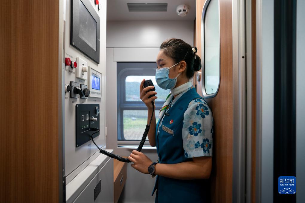 依波逢在D887次列車(chē)廣播室內為旅客播報到站廣播(7月16日攝)。