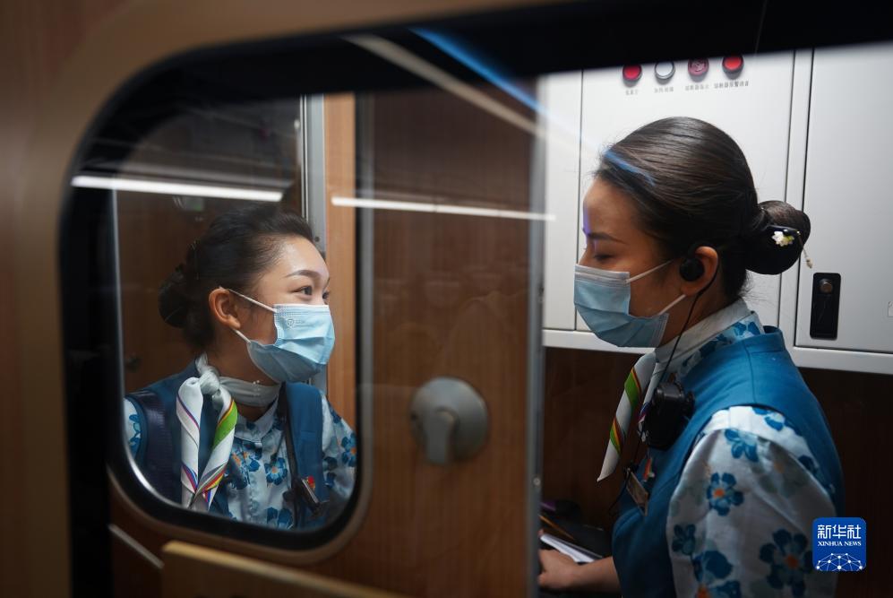 依波逢(左)在D887次列車(chē)上與同事交流工作(7月16日攝)。