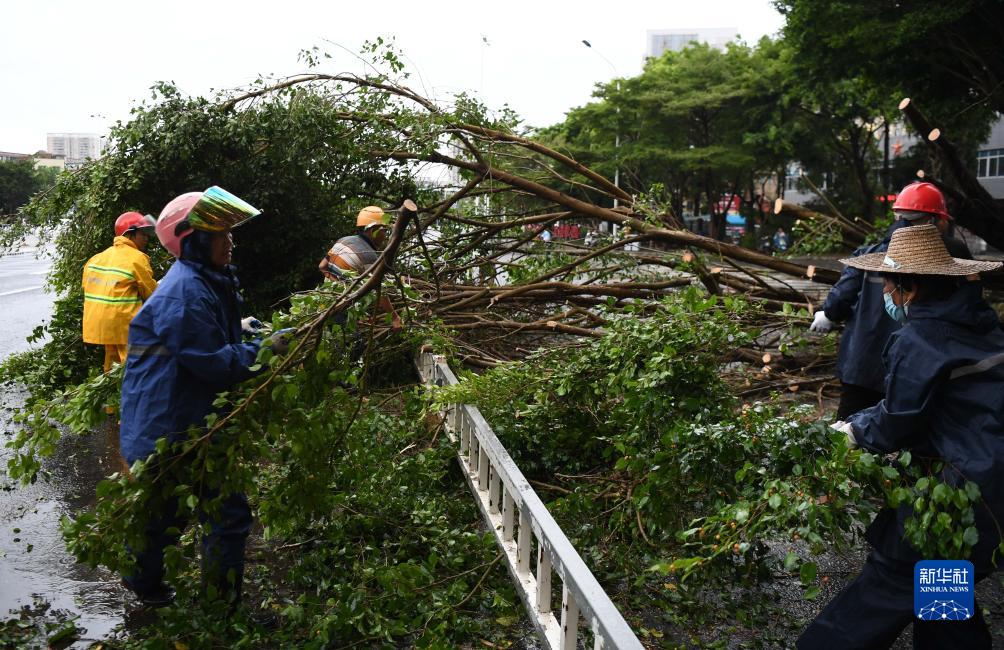 7月18日,在廣東湛江市軍民路,市政人員在清理倒伏樹(shù)木。