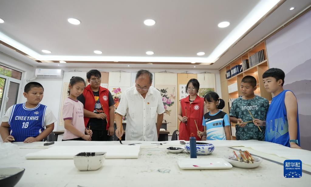 7月19日,書(shū)法愛(ài)好者在河北省唐山市豐南區新華社區開(kāi)辦的“愛(ài)心暑托班”上為孩子們講解書(shū)法知識。