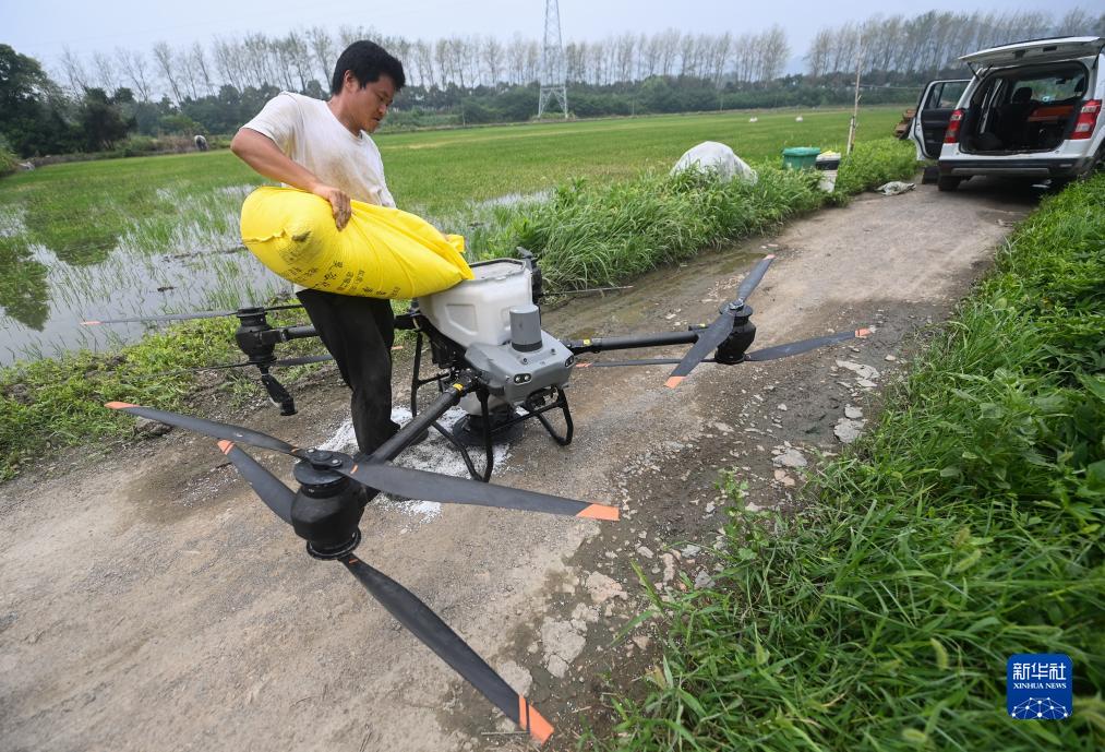 7月19日,在湖州市東林鎮保永村,種糧大戶(hù)給植保無(wú)人機裝肥料,準備為稻田施肥。