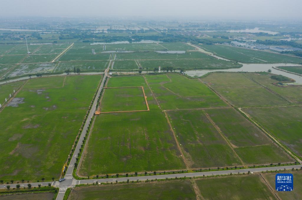 7月19日拍攝的湖州市東林鎮東華村經(jīng)過(guò)萬(wàn)畝方集中連片整治后的連片農田,田里種植了水稻(無(wú)人機照片)。