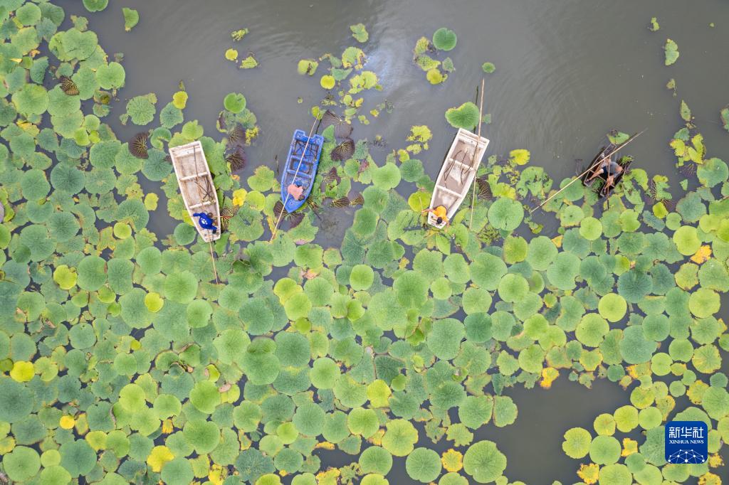 7月19日,在南縣麻河口鎮曹家鋪村,村民在采收芡實(shí)和芡實(shí)根莖(無(wú)人機照片)。