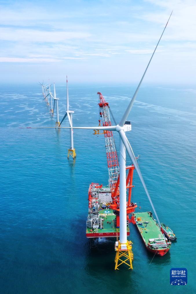 這是16兆瓦超大容量海上風(fēng)電機組安裝完成現場(chǎng)(6月28日攝,無(wú)人機照片)。
