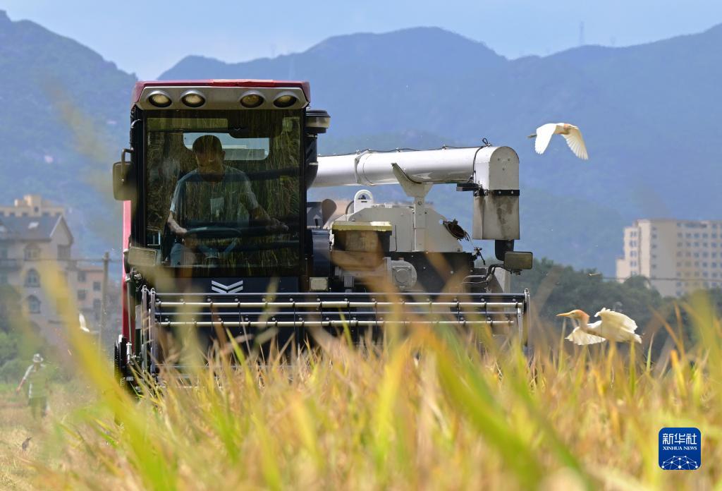 7月19日,在福建省福州市長(cháng)樂(lè )區古槐鎮洋下村,農民駕駛農機收割早稻。