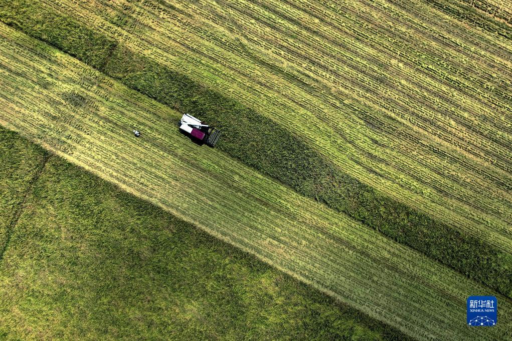 在福建省福州市長(cháng)樂(lè )區古槐鎮洋下村春欽農業(yè)專(zhuān)業(yè)合作社稻田,農民駕駛農機收割早稻(7月19日攝,無(wú)人機照片)。