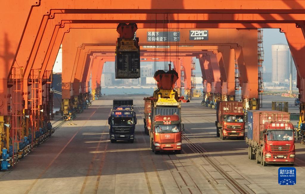 7月19日,工人在唐山港京唐港區集裝箱碼頭操作機械設備裝卸集裝箱(無(wú)人機照片)。