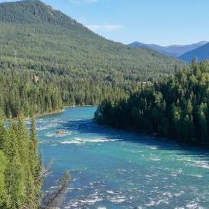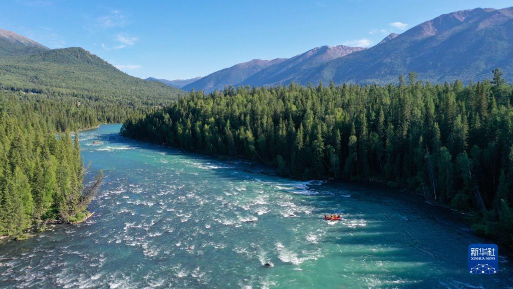 游客在新疆阿勒泰地區喀納斯景區體驗漂流項目(7月19日攝,無(wú)人機照片)。