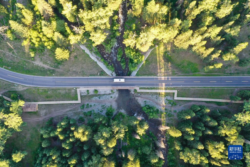 一輛旅游大巴車(chē)沿著(zhù)盤(pán)山公路進(jìn)入新疆阿勒泰地區喀納斯景區(7月19日攝,無(wú)人機照片)。