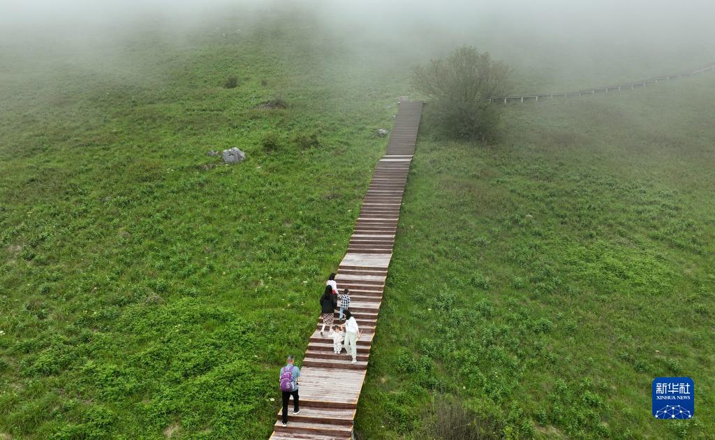 7月19日,游客沿著(zhù)木棧道在陜西省漢中市留壩縣紫柏山景區游玩(無(wú)人機照片)。