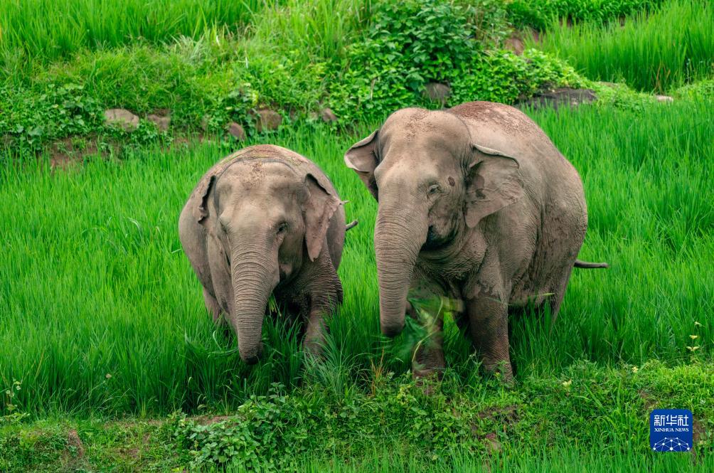 7月19日,兩頭野生亞洲象在普洱市江城縣一處稻田里覓食。