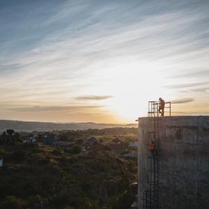 6月12日,凱爾文與同事在坦桑尼亞姆萬(wàn)扎省布斯韋盧檢查供水項目高位蓄水池(無(wú)人機照片)。