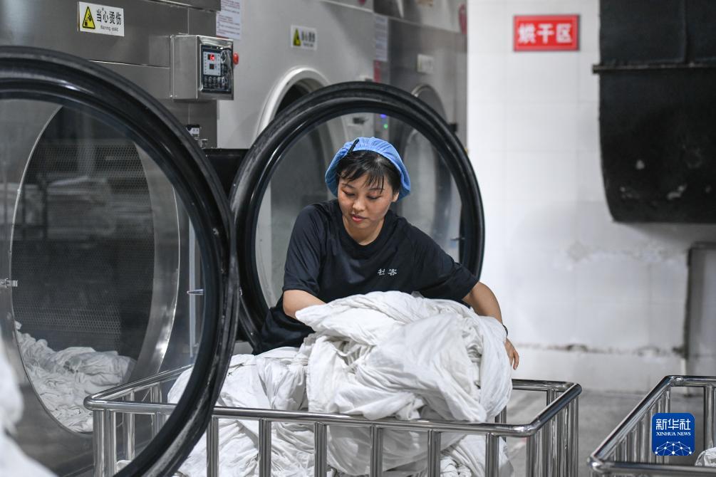 在牡丹江客運段牡(牡丹江)整備車(chē)間,洗滌二班班組成員把清洗后的列車(chē)臥具備品送進(jìn)烘干機(7月19日攝)。